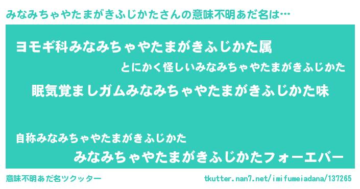 | 女子向けラノベタイトル風あだ名 | 『死神みなみちゃやたまがきふじかたの再婚』 |