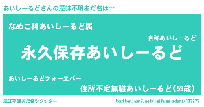 | 男性向けラノベタイトル風あだ名 | 『あいしーるどという概念が存在しない退屈な世界 』 |