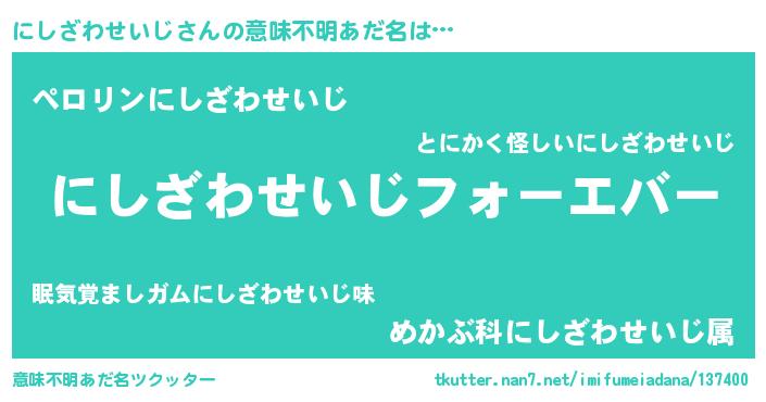 | 男性向けラノベタイトル風あだ名 | 『やはりにしざわせいじの青春ラブコメはまちがっている 』 |