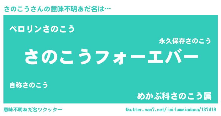 | 男性向けラノベタイトル風あだ名 | 『うちの娘の為ならば、俺はもしかしたらさのこうも倒せるかもしれない。』 |