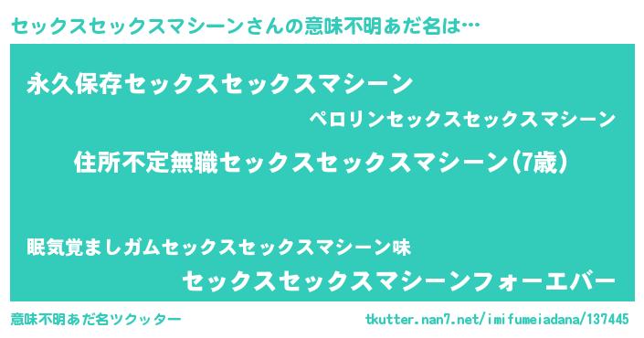 | 男性向けラノベタイトル風あだ名 | 『うちのセックスセックスマシーンが世界を掌握している!』 |