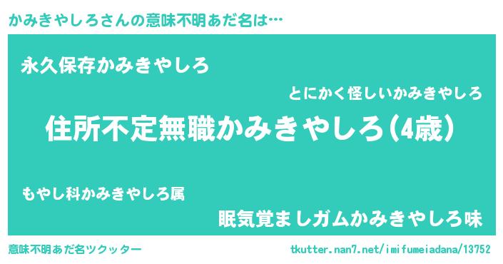 | 男性向けラノベタイトル風あだ名 | 『この素晴らしい世界にかみきやしろを!』 |