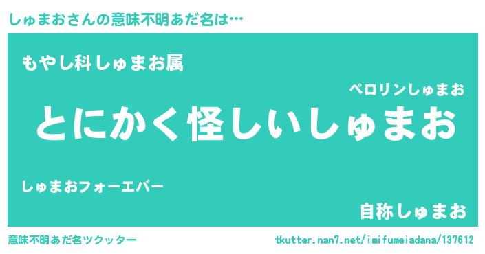 | 女子向けラノベタイトル風あだ名 | 『しゅまおは平凡を望む』 |