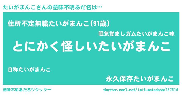 | 女子向けラノベタイトル風あだ名 | 『たいがまんこの卵を拾いまして』 |
