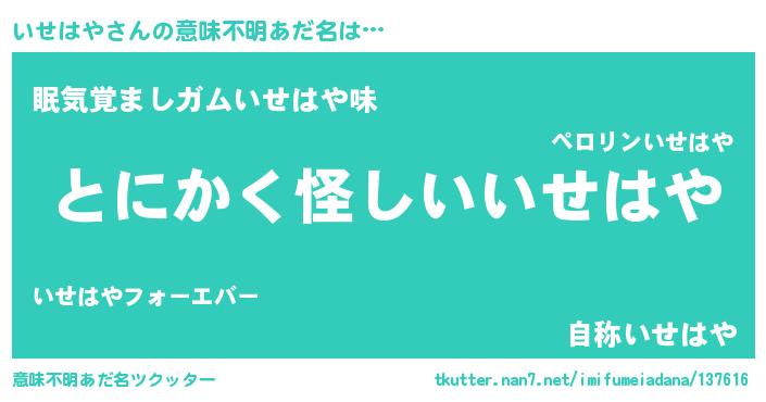 | 男性向けラノベタイトル風あだ名 | 『いせはやの嫁は女の子じゃないと思った?』 |
