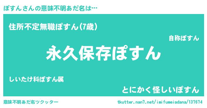 | 男性向けラノベタイトル風あだ名 | 『ぽすんという概念が存在しない退屈な世界 』 |