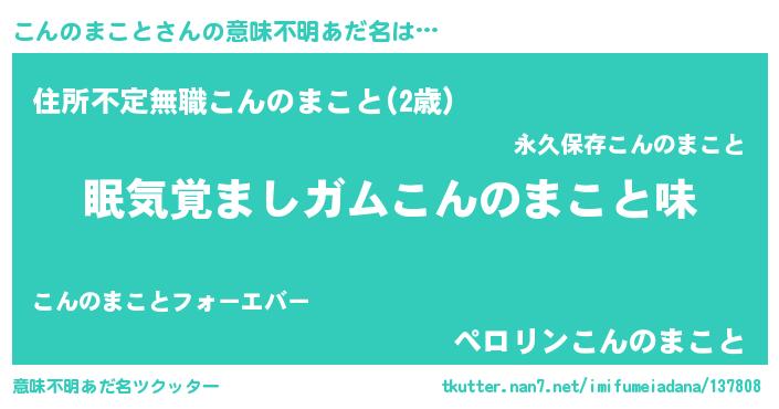 | 男性向けラノベタイトル風あだ名 | 『こんのまことに滅ぼされるだけの簡単なお仕事です』 |