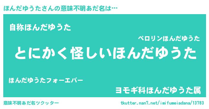 | 男性向けラノベタイトル風あだ名 | 『ダンジョンにほんだゆうたを求めるのは間違っているだろうか』 |