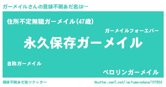 | 男性向けラノベタイトル風あだ名 | 『ガーメイルという概念が存在しない退屈な世界 』 |