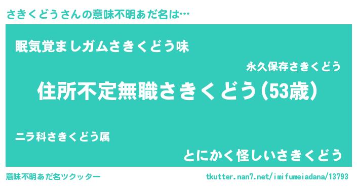 | 男性向けラノベタイトル風あだ名 | 『さきくどうに滅ぼされるだけの簡単なお仕事です』 |