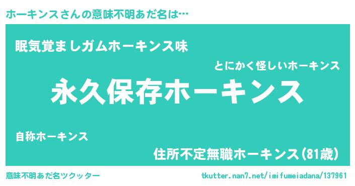 | 胡散臭い通販商品みたいなあだ名 | 『前代未聞の水素水…その名も「ホーキンス」』 |