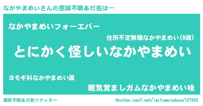 | 男性向けラノベタイトル風あだ名 | 『なかやまめいの嫁は女の子じゃないと思った?』 |