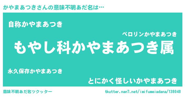 | 男性向けラノベタイトル風あだ名 | 『転生したらかやまあつきだった件』 |