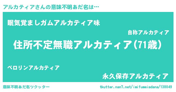 | 男性向けラノベタイトル風あだ名 | 『この素晴らしい世界にアルカティアを!』 |