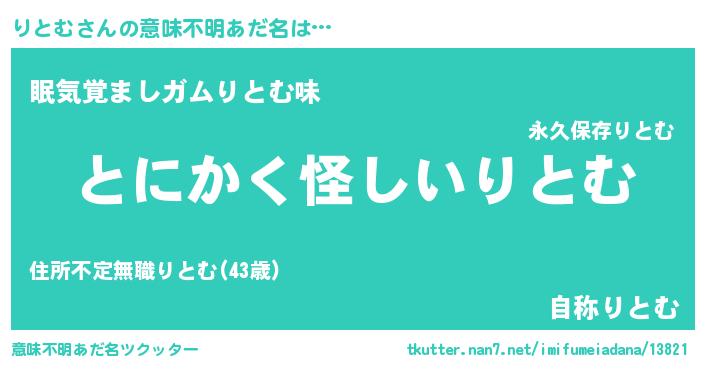 | 男性向けラノベタイトル風あだ名 | 『りとむの嫁は女の子じゃないと思った?』 |