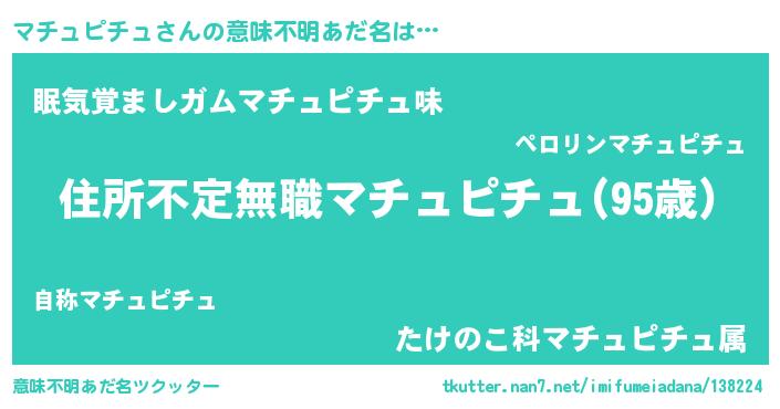 | 男性向けラノベタイトル風あだ名 | 『魔弾の王とマチュピチュ』 |