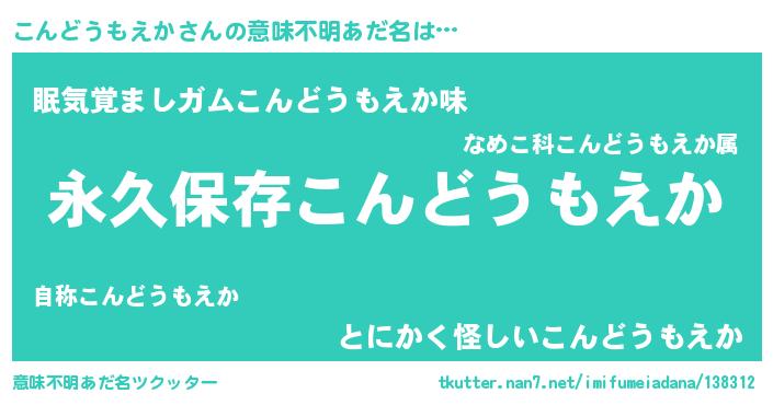 | 胡散臭い通販商品みたいなあだ名 | 『絶対に幸福をもたらす水素水…その名も「こんどうもえか」』 |