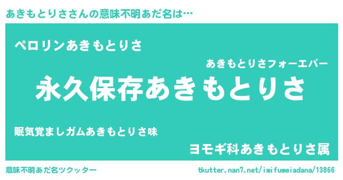 | 女子向けラノベタイトル風あだ名 | 『異世界で失敗しない100のあきもとりさ』 |
