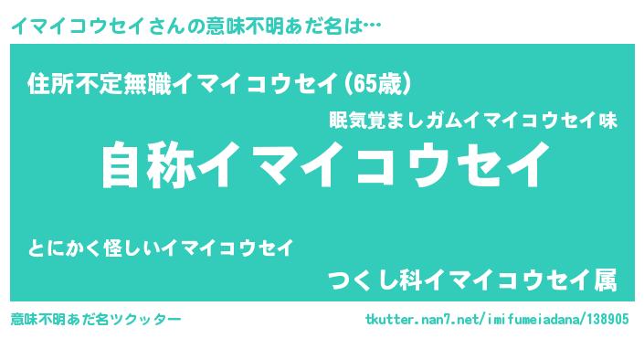 | 男性向けラノベタイトル風あだ名 | 『イマイコウセイに滅ぼされるだけの簡単なお仕事です』 |