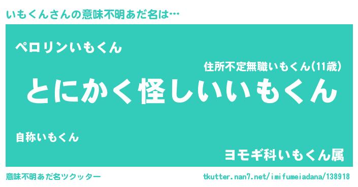 | 男性向けラノベタイトル風あだ名 | 『いもくんに滅ぼされるだけの簡単なお仕事です』 |