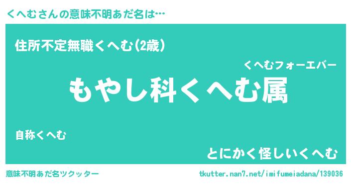 | 男性向けラノベタイトル風あだ名 | 『くへむに滅ぼされるだけの簡単なお仕事です』 |