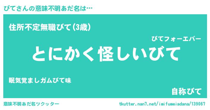 | 女子向けラノベタイトル風あだ名 | 『びては平凡を望む』『闇のびて』 |