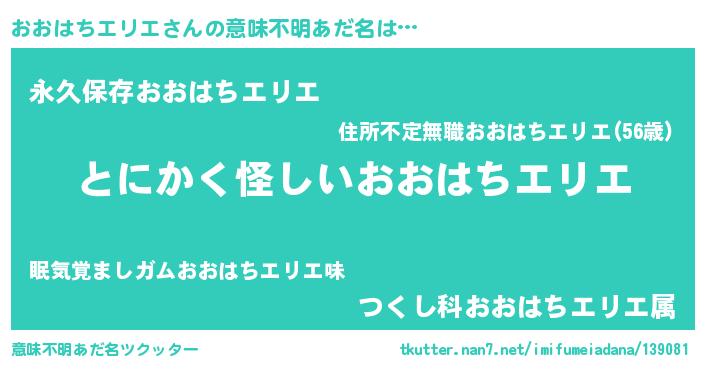 | 男性向けラノベタイトル風あだ名 | 『おおはちエリエの嫁は女の子じゃないと思った?』 |