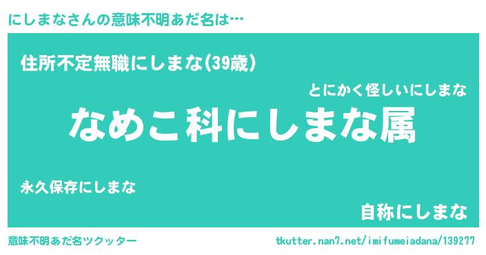 | 男性向けラノベタイトル風あだ名 | 『転生したらにしまなだった件』 |