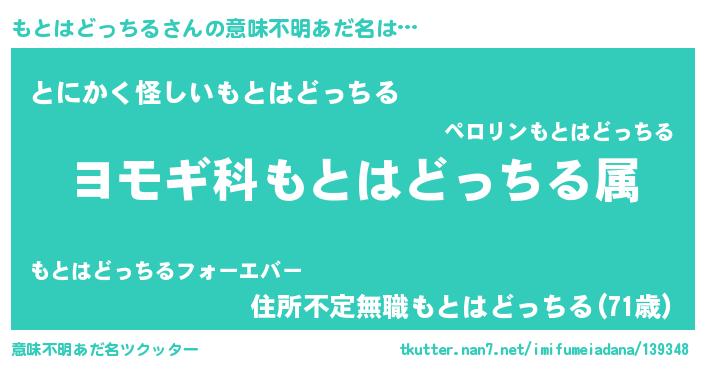 | 男性向けラノベタイトル風あだ名 | 『もとはどっちる~年齢イコール彼女いない歴の魔法使い~』 |