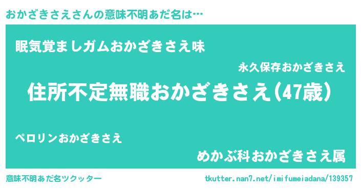 | 男性向けラノベタイトル風あだ名 | 『おかざきさえに滅ぼされるだけの簡単なお仕事です』 |
