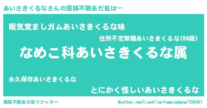 | 男性向けラノベタイトル風あだ名 | 『転生したらあいさきくるなだった件』 |