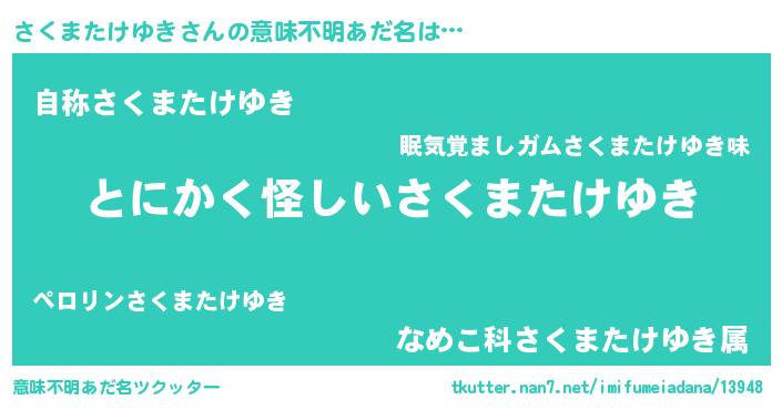 | 男性向けラノベタイトル風あだ名 | 『ダンジョンにさくまたけゆきを求めるのは間違っているだろうか』 |