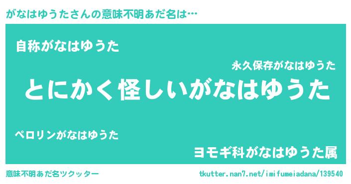| 胡散臭い通販商品みたいなあだ名 | 『信頼と実績のサプリメント…その名も「がなはゆうた」』 |