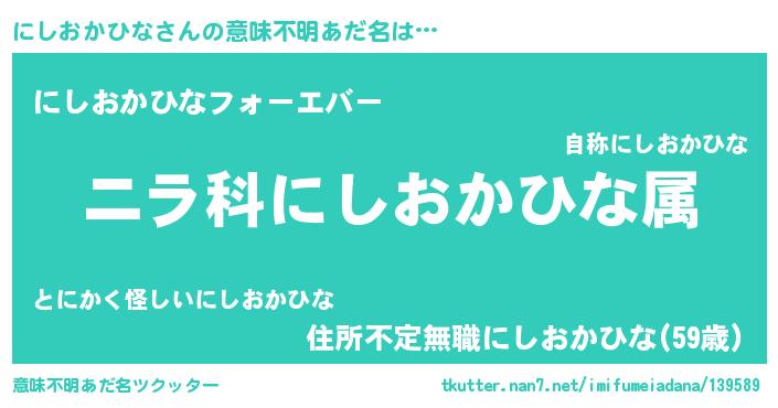 | 男性向けラノベタイトル風あだ名 | 『にしおかひな~年齢イコール彼女いない歴の魔法使い~』 |
