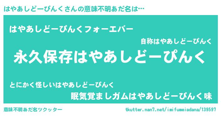 | 男性向けラノベタイトル風あだ名 | 『はやあしどーぴんくという概念が存在しない退屈な世界 』 |