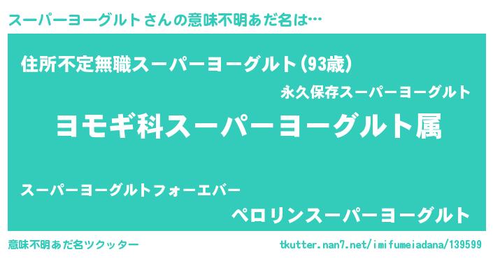 | 男性向けラノベタイトル風あだ名 | 『スーパーヨーグルト~年齢イコール彼女いない歴の魔法使い~』 |