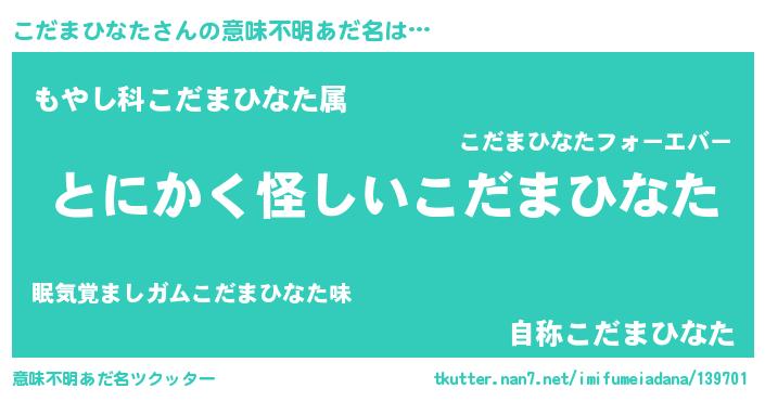 | 男性向けラノベタイトル風あだ名 | 『こだまひなたの嫁は女の子じゃないと思った?』 |