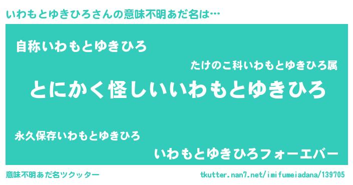| 男性向けラノベタイトル風あだ名 | 『ダンジョンにいわもとゆきひろを求めるのは間違っているだろうか』 |