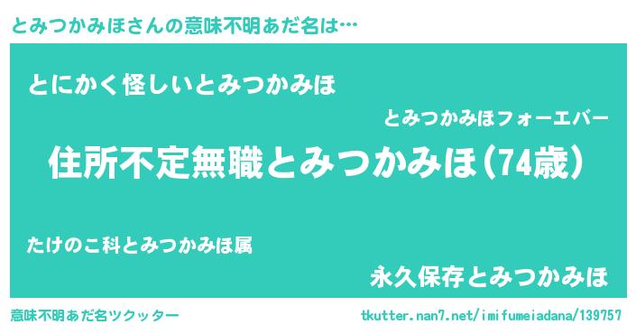 | 男性向けラノベタイトル風あだ名 | 『魔弾の王ととみつかみほ』 |