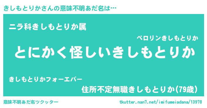 | 女子向けラノベタイトル風あだ名 | 『きしもとりかの卵を拾いまして』 |