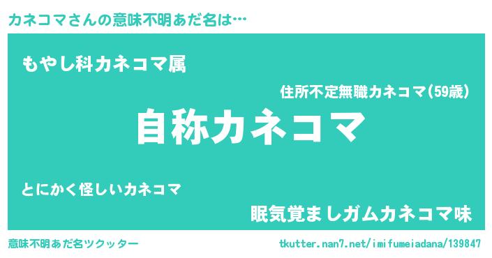 | 男性向けラノベタイトル風あだ名 | 『Re:カネコマから始める異世界生活』 |