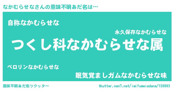 | 男性向けラノベタイトル風あだ名 | 『なかむらせな~年齢イコール彼女いない歴の魔法使い~』 |