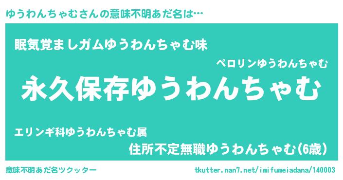 | 男性向けラノベタイトル風あだ名 | 『ゆうわんちゃむという概念が存在しない退屈な世界 』 |