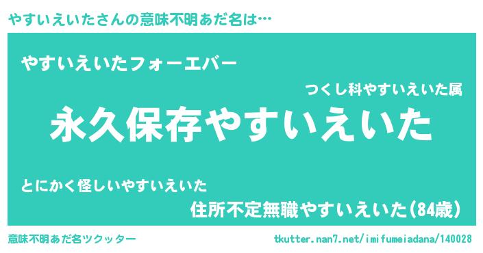 | 男性向けラノベタイトル風あだ名 | 『やすいえいたに滅ぼされるだけの簡単なお仕事です』 |