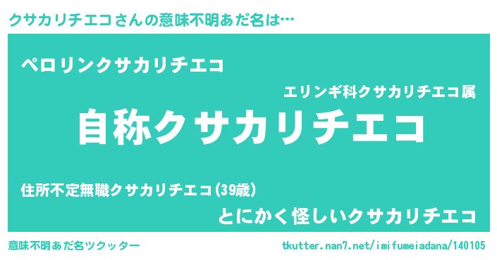 | 男性向けラノベタイトル風あだ名 | 『Re:クサカリチエコから始める異世界生活』 |