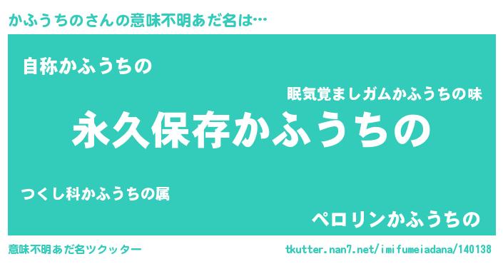 | 男性向けラノベタイトル風あだ名 | 『かふうちのという概念が存在しない退屈な世界 』 |