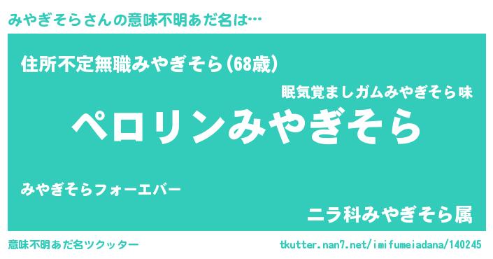 | ヘコむあだ名 | 『みやふぇ~』『レバニラ』『みやを』 |