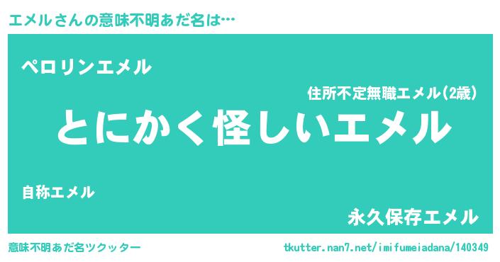 | 男性向けラノベタイトル風あだ名 | 『エメルの嫁は女の子じゃないと思った?』 |
