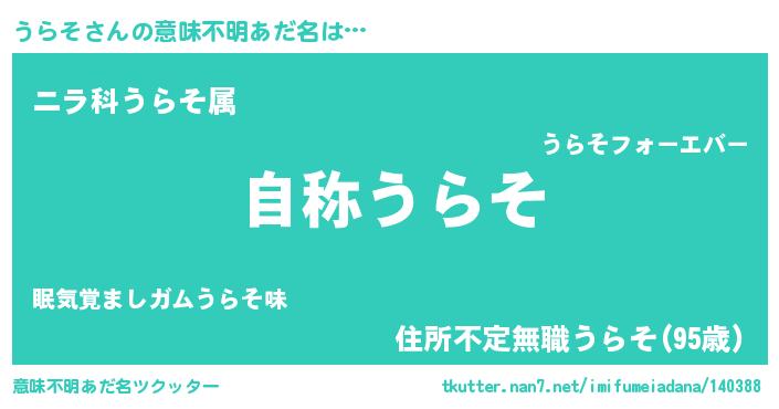 | 男性向けラノベタイトル風あだ名 | 『Re:うらそから始める異世界生活』 |