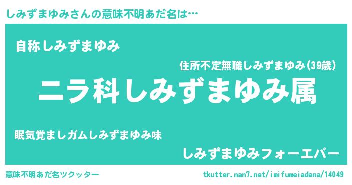 | 男性向けラノベタイトル風あだ名 | 『うちのしみずまゆみが世界を掌握している!』 |